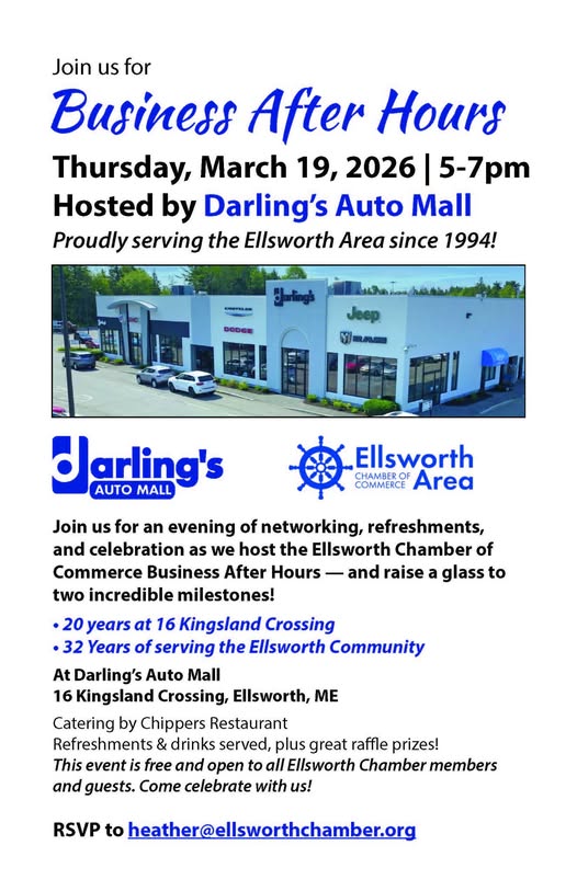 Join us for an evening of networking, refreshments and celebration as we host the Ellsworth Chamber of Commerce Business After Hours. RSVP to Heather@ellsworthchamber.org